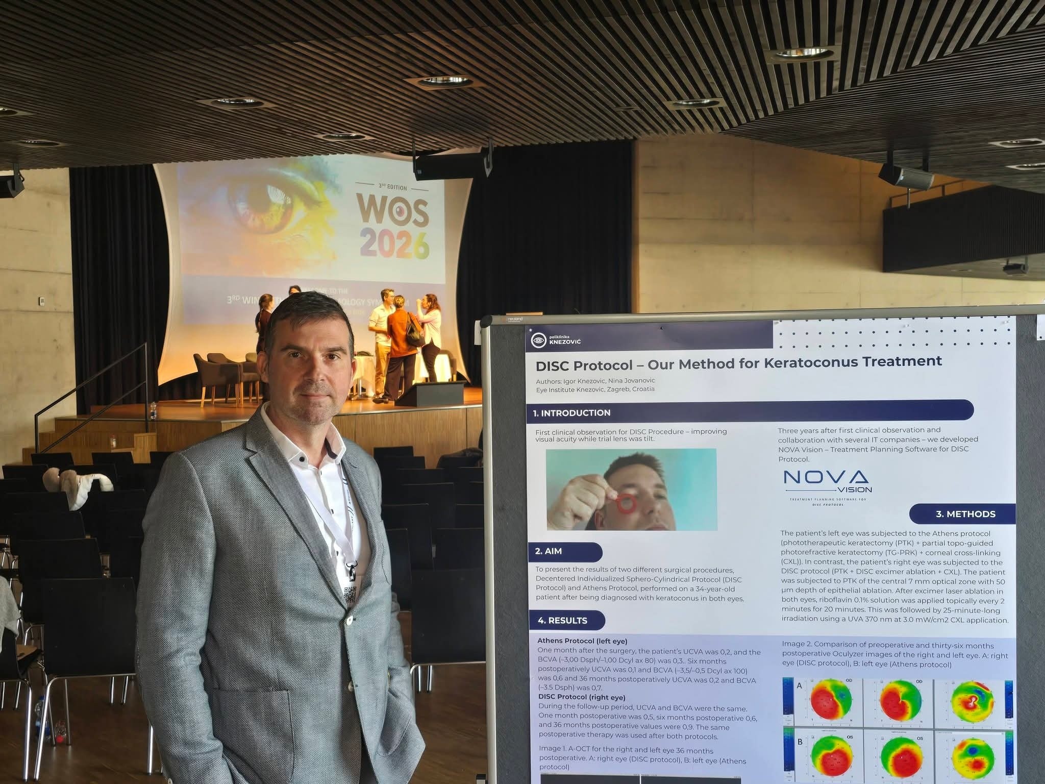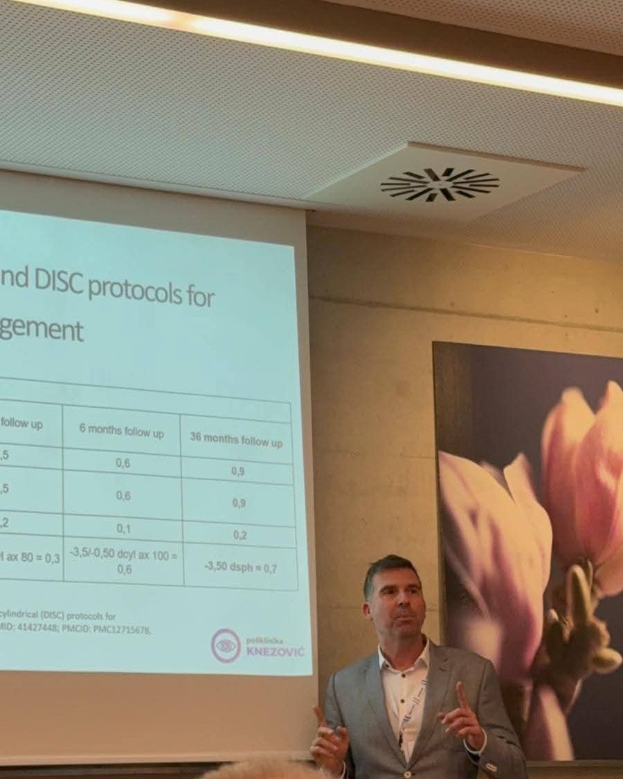 Glavna tema našeg izlaganja bila je naša autorska metoda za liječenje keratokonusa – DISC Protocol. Ovaj laserski operativni zahvat, osmišljen i usavršen upravo u Poliklinici Knezović, predstavlja značajan iskorak u liječenju ove kompleksne bolesti rožnice.